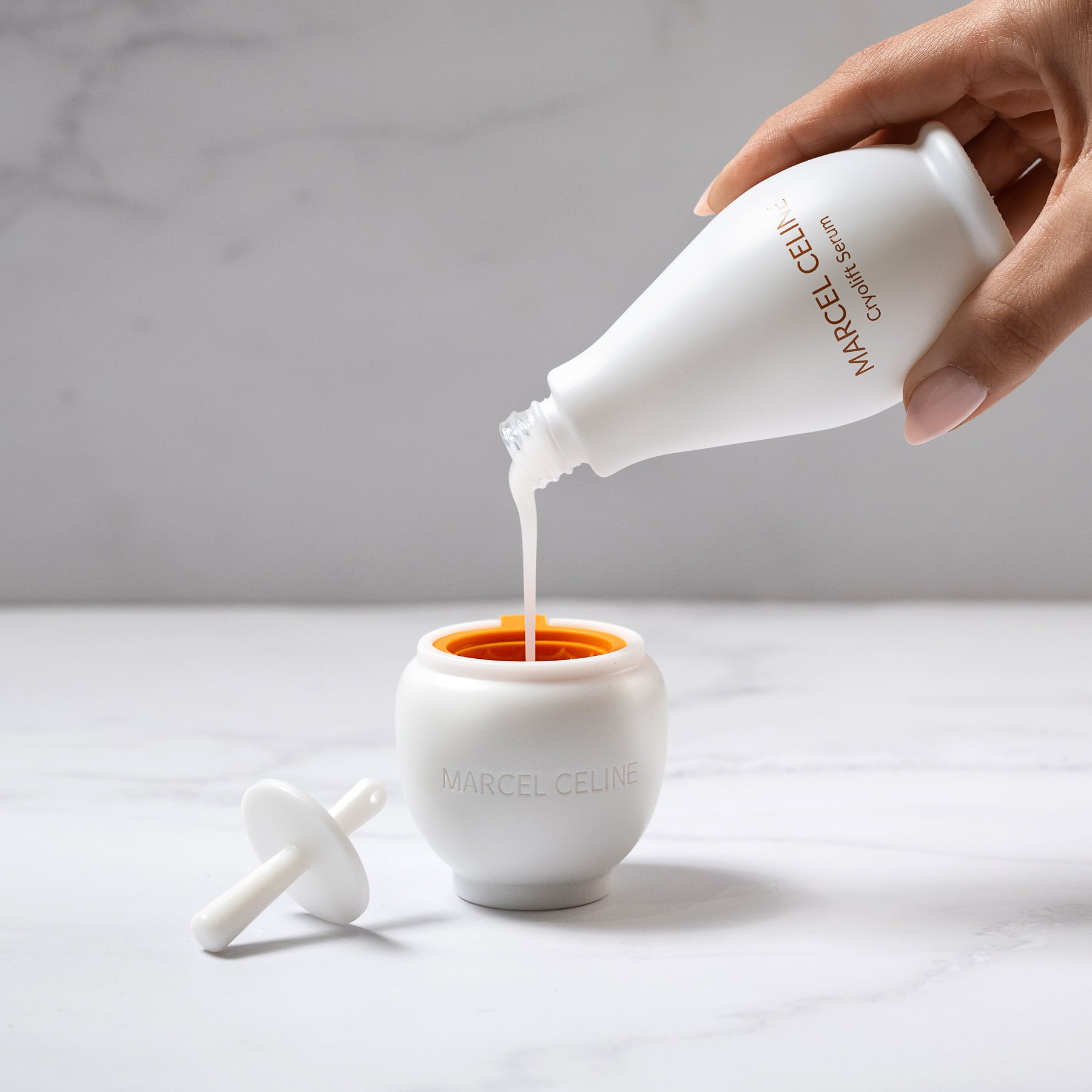 Pour the Cryolift Serum into the silicone mould, stopping just below the marked line to avoid overflow. Once filled, place the applicator lid on top to cover the serum.
